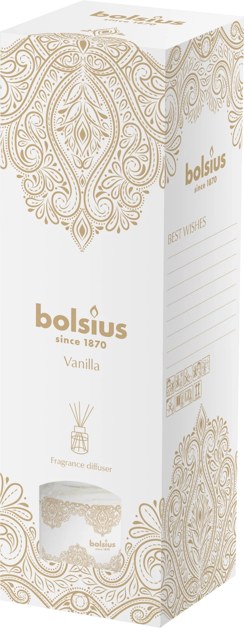 Diffuzor Bolsius karácsonyi arany csipke, vanília, 30 ml, tegye kellemesebbé otthonát a sütemények vanília illatával és egy csipkés régies mintával, karácsonyi hangulatot teremtve.
