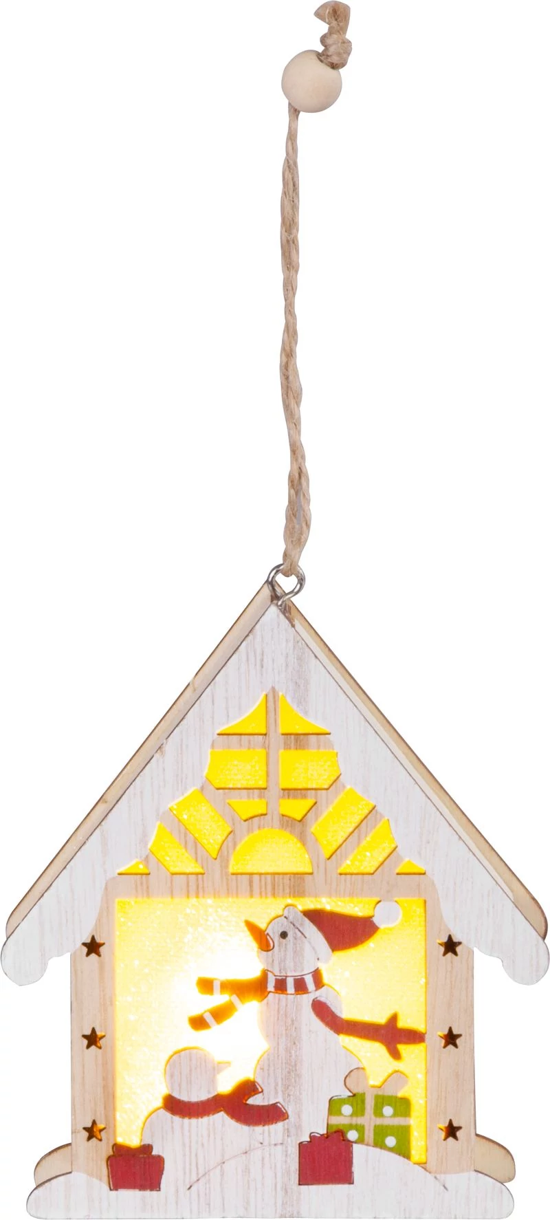 A MagicHome felfüggeszthető hóember házikóban dekoráció ízléses beltéri kiegészítő a karácsonyi ünnepek alatt. Ez egy karácsonyi dekoráció LED világítással. A LED színe meleg fehér és a LED-ek száma 1. A védelmi osztály IP 20, csak belső használatra szolgál. Egyszerű világítási funkcióval és BE/KI kapcsolóval rendelkezik. Az áramellátást 1x CR2032 elem biztosítja, amely a termékdoboz része. A fényforrások nem cserélhetok. Méretei 9,2 x 3 x 10,4 cm.