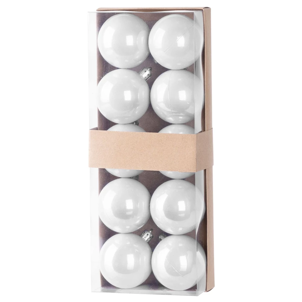 A karácsonyfa díszkészlet a karácsonyfa ünnepi díszítésére szolgál. 10 db 5 cm átmérőjű darabból álló karácsonyi gömbből áll. A gömbök színe fehér. Műanyagból készült.