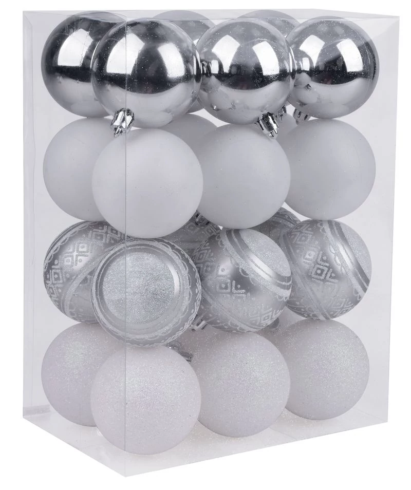 A karácsonyfa díszkészlet a karácsonyfa ünnepi díszítésére szolgál. 24 db 6 cm átmérőjű darabból álló karácsonyi gömbből áll. A gömbök színe fehér-ezüst. Műanyagból készült.