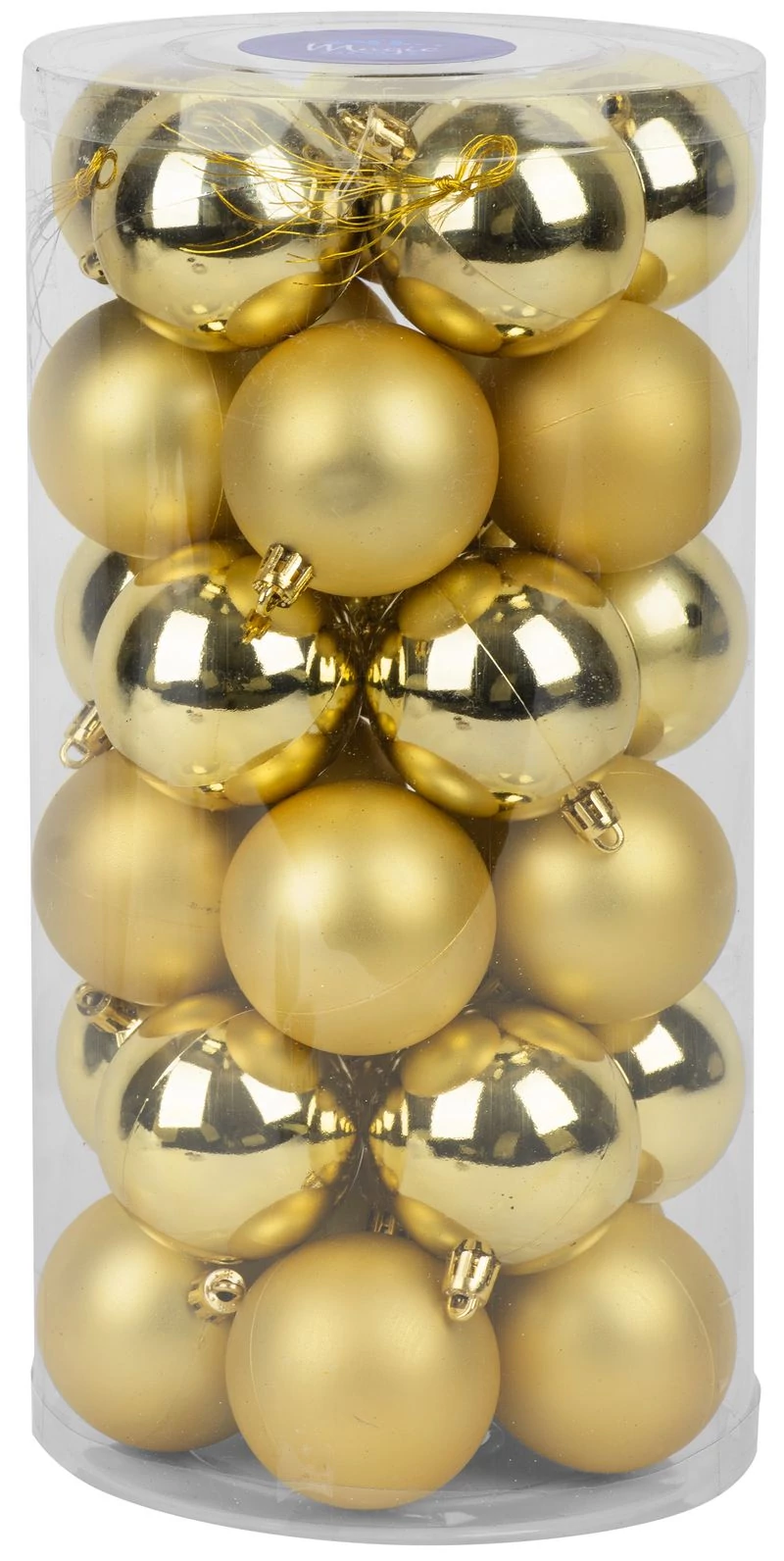 A karácsonyfa díszkészlet a karácsonyfa ünnepi díszítésére szolgál. 30 db 6 cm átmérőjű darabból álló karácsonyi gömbből áll. A gömbök színe arany. Műanyagból készült.