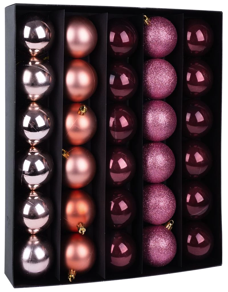 A karácsonyfa díszkészlet a karácsonyfa ünnepi díszítésére szolgál. 30 db 6 cm átmérőjű darabból álló karácsonyi gömbből áll. A gömbök színe réz-rózsaszín. Műanyagból készült.
