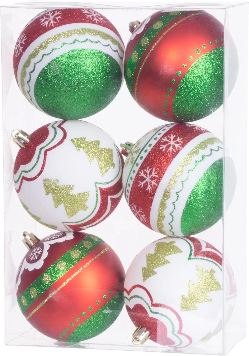 A karácsonyfa díszkészlet a karácsonyfa ünnepi díszítésére szolgál. 6 db 8 cm átmérőjű darabból álló karácsonyi gömbből áll. A gömbök színe piros-zöld, dekorációval. Műanyagból készült.