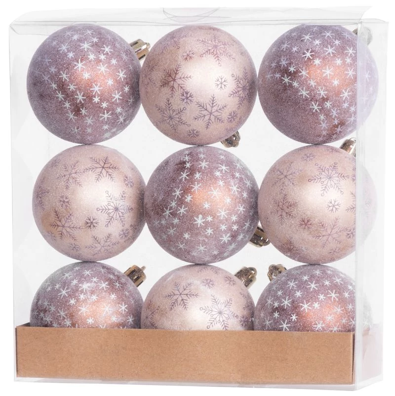 A karácsonyfa díszkészlet a karácsonyfa ünnepi díszítésére szolgál. 9 db 6 cm átmérőjű darabból álló karácsonyi gömbből áll. A díszített gömbök színe bronz, matt, dekorációval. Műanyagból készült.