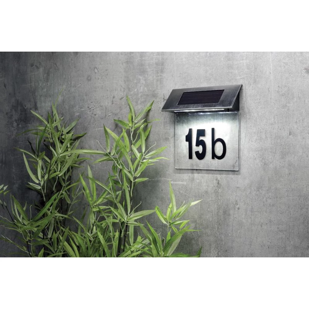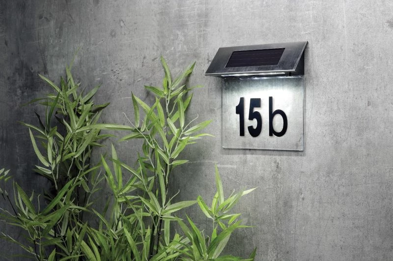 Az elegáns MagicHome napelemes házszám nagyszerű kiegészítője lesz otthonának. Tökéletes megoldás elektromos csatlakozás nélküli falra. Kiváló minoségű rozsdamentes acélból és muanyagból készült. A számok felragasztására szánt felületet 4 db LED lámpa világítja meg, így a számok sötétedés után ragyogóan kiemelkednek. Az akkumulátort napközben napelem tölti fel, a maximális fénykapacitás kb. 8 óra. A csomag 3x 0-9 öntapadós számot és 1x a-h betuket tartalmaz. Méretek: 18,5 x 5 x 19 cm.
